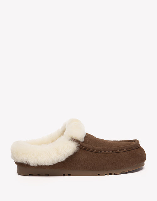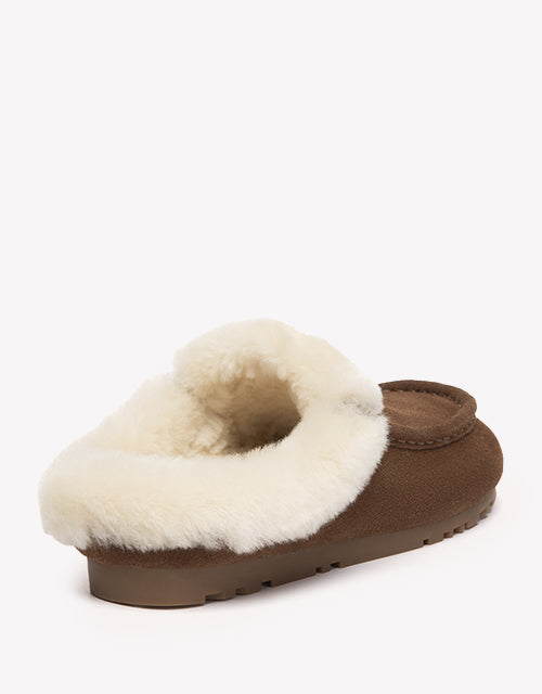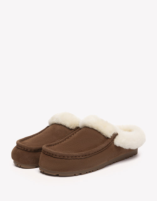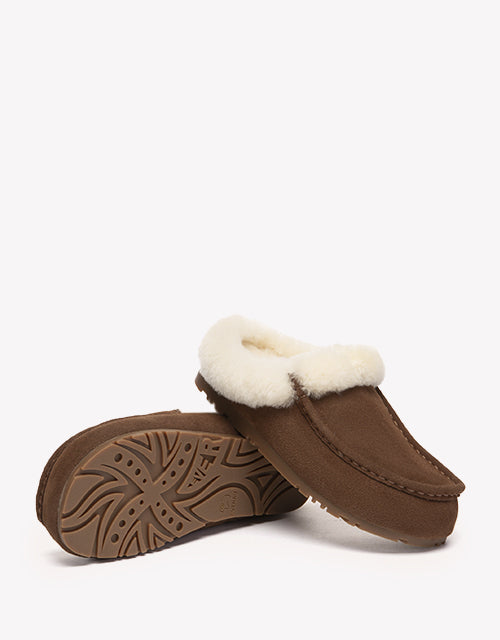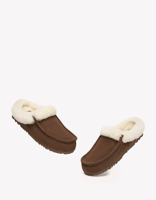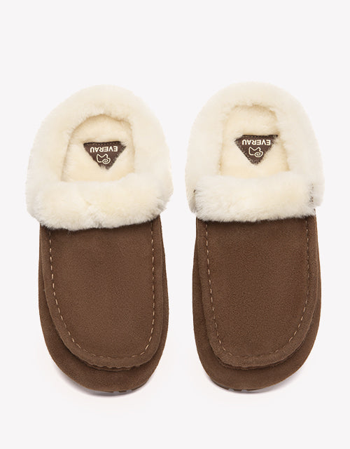 Stay warm and stylish with the EVERAU Sheepskin Moccasin Slippers. A plush wool collar wraps around the opening for extra warmth and a touch of playful charm, while the braided trim adds handcrafted detail to the soft cow suede upper. Fully lined with genuine sheepskin, this pair delivers the perfect balance of cozy comfort and casual ease.