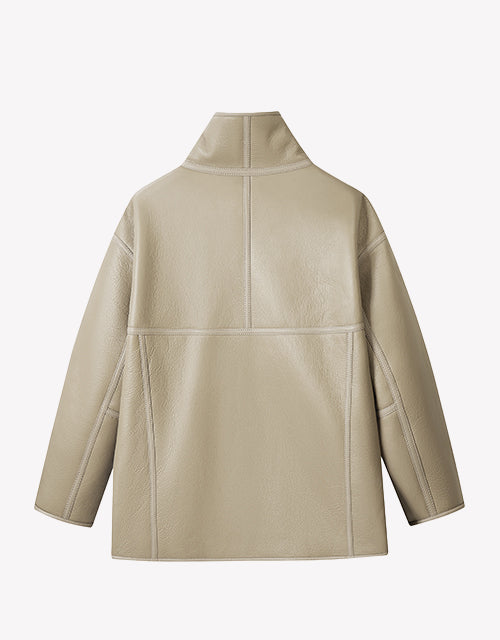 Crafted from double-face sheepskin, this reversible design offers two refined expressions in one composed silhouette. The wool provides natural warmth with a balanced, structured feel, while the clean lines suit modern urban dressing. A sculpted stand collar and refined button closure add quiet definition, complemented by functional patch pockets. A versatile women’s wool jacket and a considered winter gift for family, friends, or yourself.